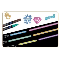Keep Smiling Outline Marker Dekoratif Kalem Seti 1 mm 10’lu LBK-0001Kullanımı:Kapak takılı olarak iyice çalkalayınUçtaki havayı boşaltmak için aşağı bastırın. (Not: Hava serbest bırakılmazsa boya sıçrayabilir.)Boya akışı için ucu tekrar tekrar yüzeye bastırın. (Not: Çok fazla bastırmak fazla boyaya neden olabilir.)Sanat eserinizi boyayın.Kalemi kullandıktan sonra tekrar kapatın ve yatay olarak saklayın.Bastırmadan ve tekrar boyamadan önce mürekkebi eşit şekilde çalkalayın.El işi, taş, plastik, cam, yaratıcı yazı, deri, kanvas, kumaş, seramik vb. üzerinde kullanılabilir.Gerekli Bilgiler:Sadece beyaz kağıt üzerinde ortasında gümüş olan iki çizgi aynı anda gösterilebilir, siyah kağıt üzerine boyarsanız sadece gümüşü gösterebilirsiniz.Yazı yazmak için 80 gramın üzerinde kağıt kullanılması tavsiye edilir. 80 gramdan daha hafif kağıtların nüfuz etmesi kolaydır.